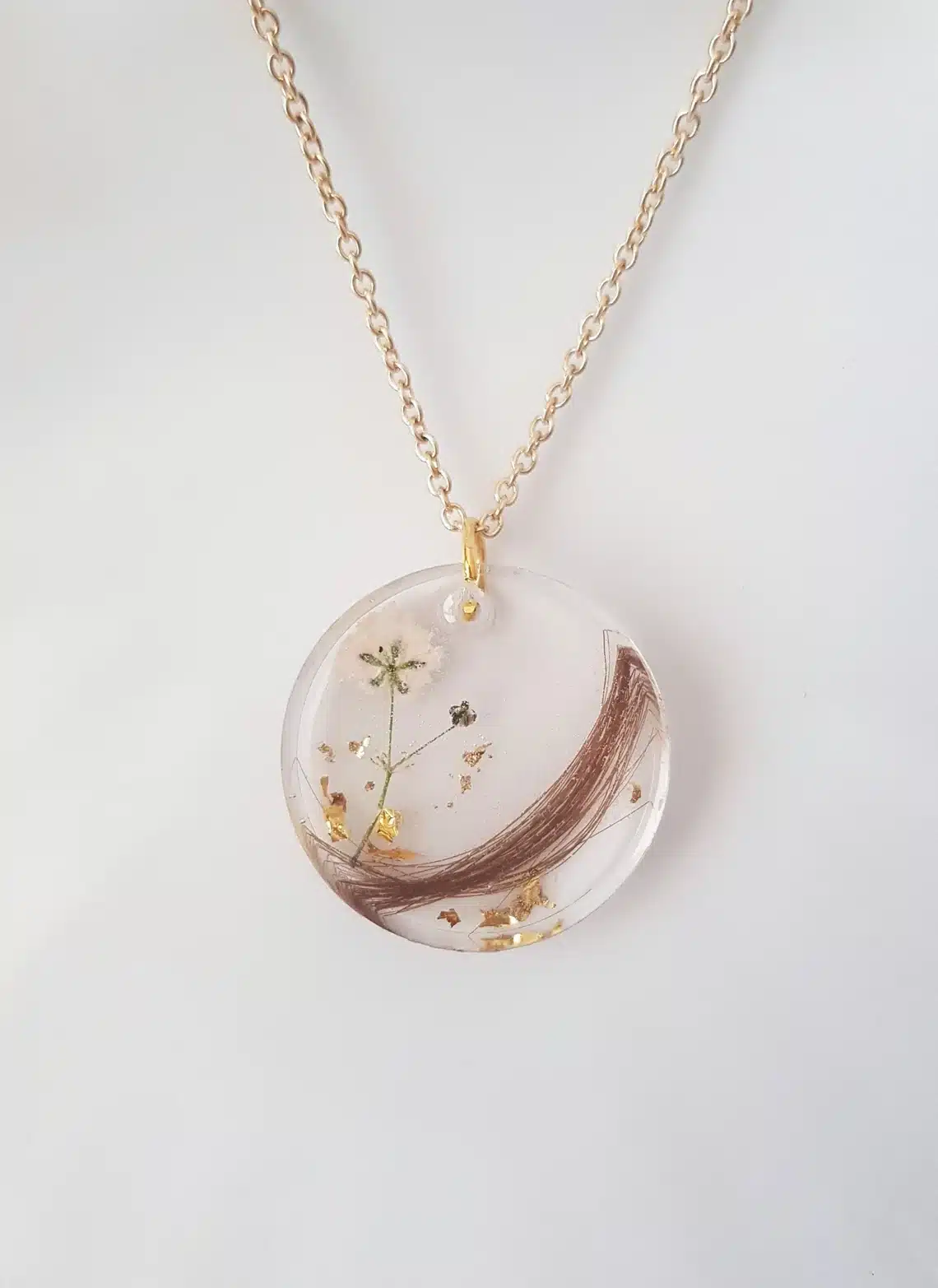 Ingebed in helder, zacht glinsterend hars lijkt het haarlokje bijna bevroren in een druppel geheugen. Als het licht erop valt, straalt het warm en zacht, bijna alsof je door een oud familiealbum bladert en plotseling de baby weer hoort lachen.